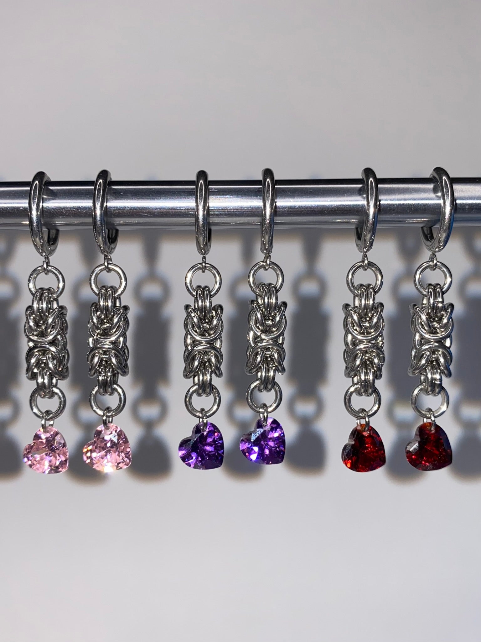 The Poisoned Candy Earrings are available in six colors: pink, amethyst, garnet, black, peridot and clear – you can also mix & match the colors to best fit your aesthetics.
