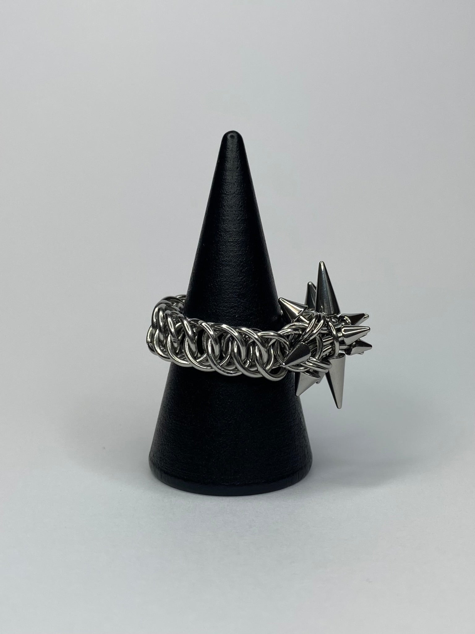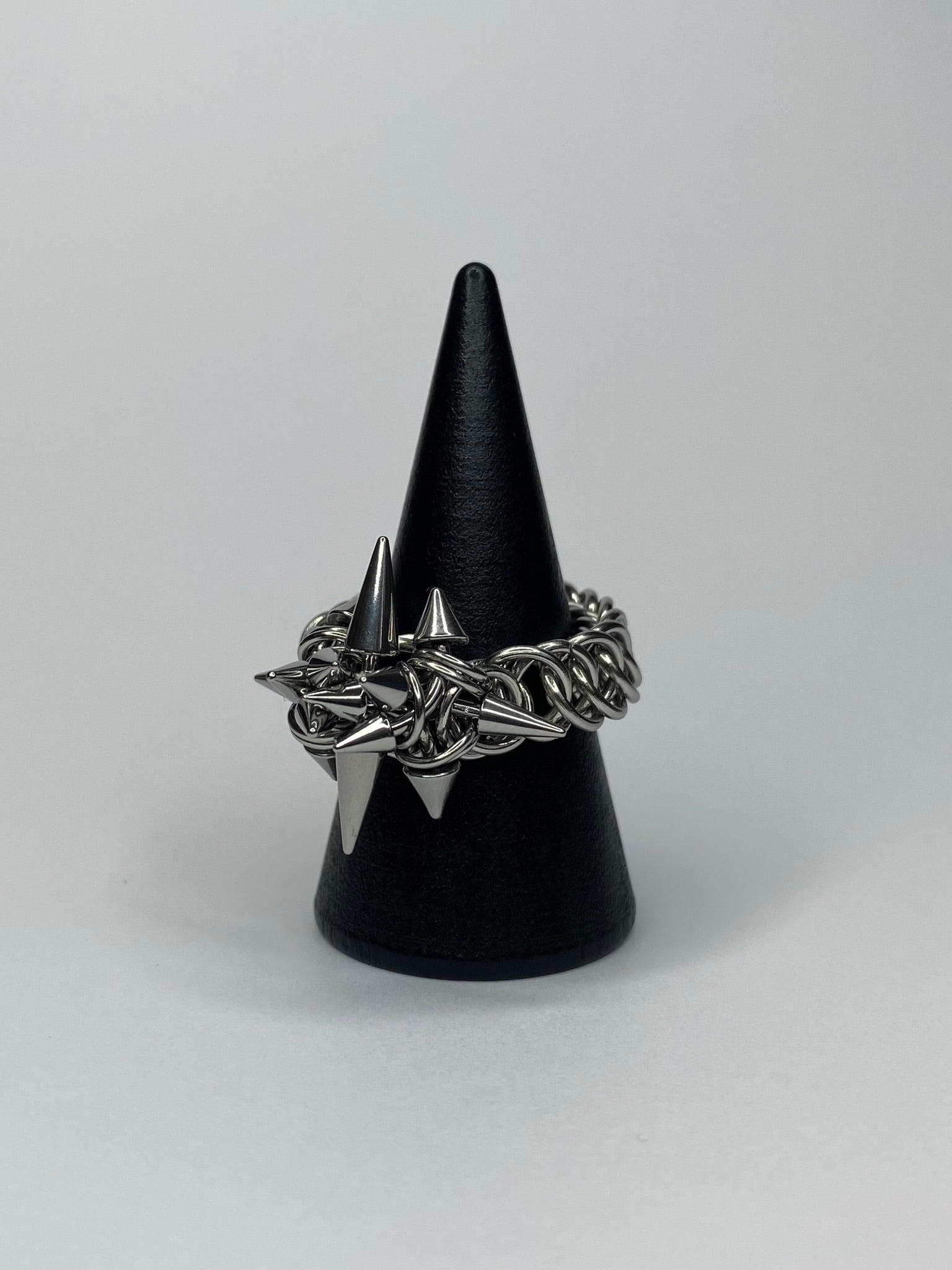 Inspired by Sauron's fearsome physical form, this ring reimagines the Dark Lord’s crown as both protection and adornment— stainless steel jump rings and piercing-grade spikes make a bold shield for your individuality. Wear it to “rule your realm” and express yourself without compromise.